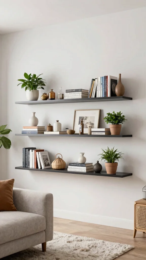 Open shelving beautifully fills empty walls, merging functionality and style. Floating shelves provide a platform to showcase your favorite books, plants, and decorative items. Arrange them asymmetrically for a modern vibe or in neat rows for a more classic look. Mixing items of varied heights and textures creates visual interest and makes your living area feel warm and inviting.