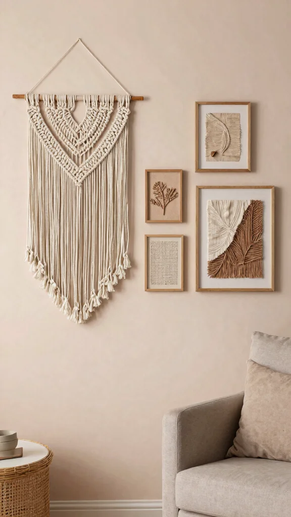 Adding textured wall art introduces a three-dimensional quality to your living room, making the decor feel lively and engaging. Seek out fabric wall hangings, macramé pieces, or framed fabric swatches that add tactile contrast to the smooth surfaces of your walls and furniture.