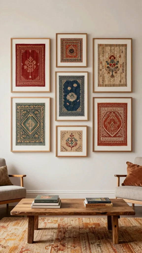 Framed textiles can add a unique artistic flair to your walls. Think about framing vintage scarves, quilts, or fabric remnants to introduce softness and color to your living room. This approach allows you to showcase patterns without overwhelming the space, making it a great conversation starter.