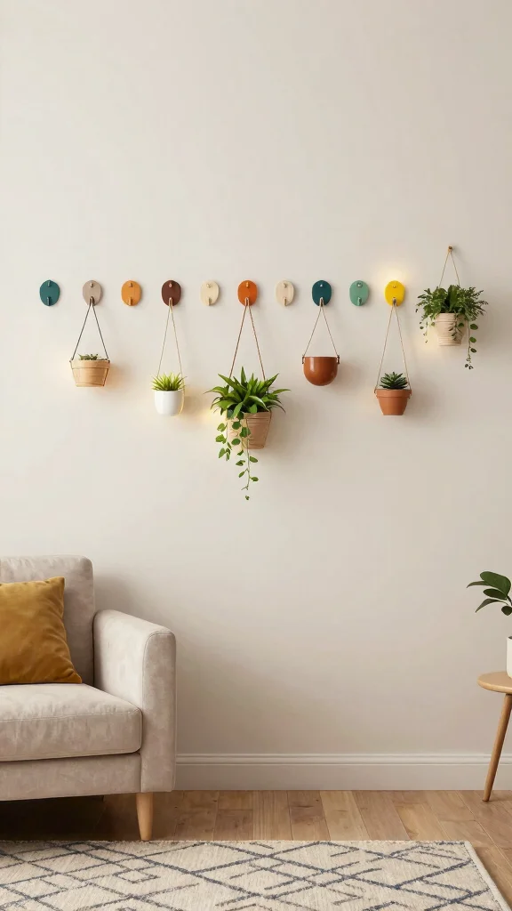 Creative wall hooks give your living room a quirky personal touch while keeping it organized.