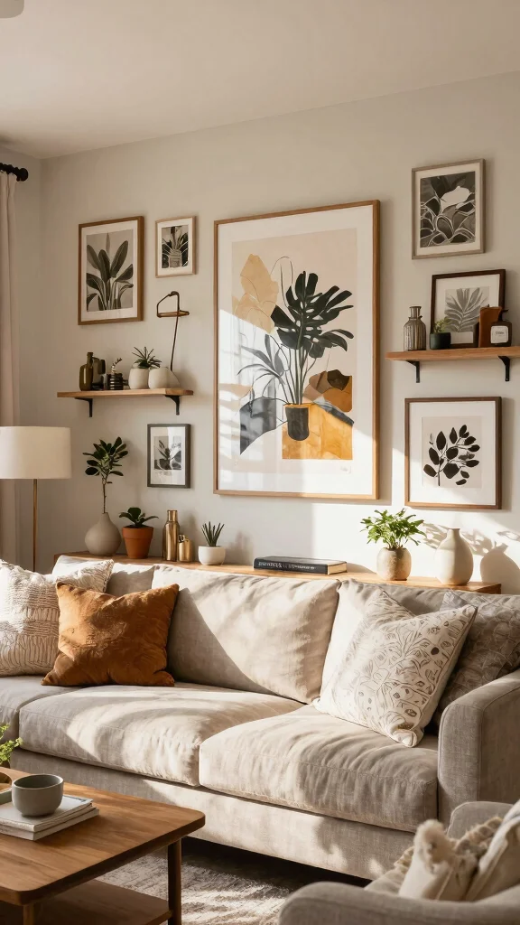 Great news: you don’t need to overspend to achieve a high-end look. Try wall decor ideas like printable artwork in inexpensive frames, thrift-store frames repainted to unify tones, DIY canvas or fabric-based art, and wall decals or tape art. Add texture with mirrors or fabric wall hangings, and layer a few creative wall art pieces together with a cohesive color palette. Use empty wall solutions like a leaning mirror and a small shelf to create visual interest without crowding the room. With a bit of creativity, these affordable options can elevate your interior decorating tips—and your living room design.