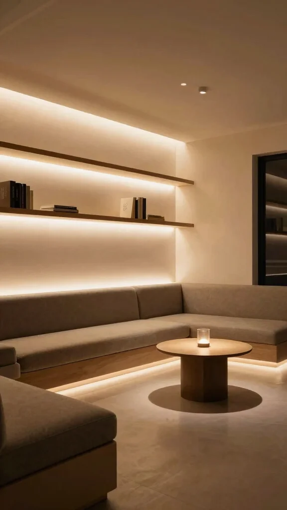 Keep furniture low-profile to avoid crowding the ceiling height. For lighting, apply lighting solutions for basements: recessed LED can lights, wall sconces, and ambient uplights along walls.