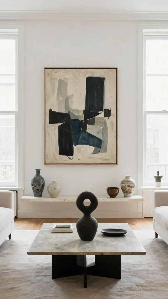 Art adds depth and cultivates a welcoming ambiance, enriching the minimalist foundation of your living room.