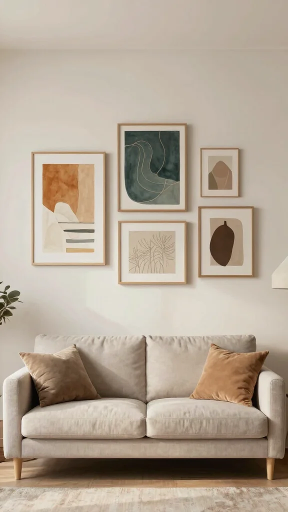 To implement this look, opt for art that complements your existing furniture. You might consider a large canvas as a focal point, balanced by smaller prints nearby. Natural wood frames can enhance the organic feel of these tones, blending seamlessly with your decor.