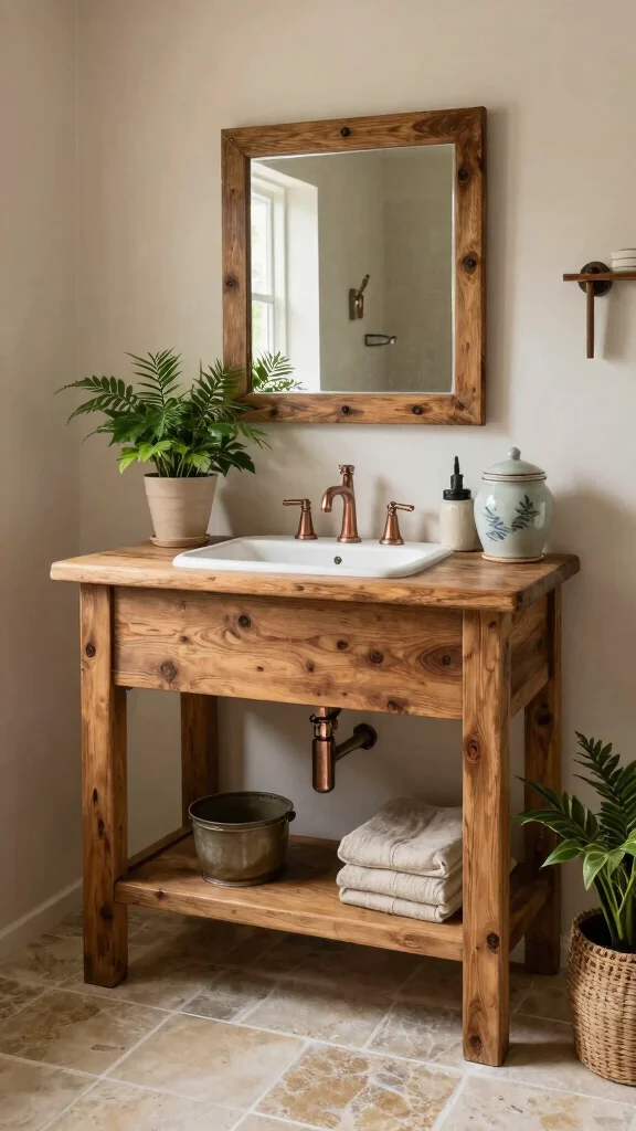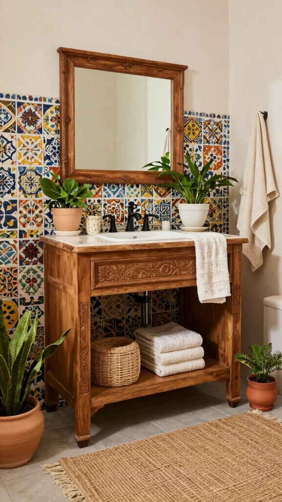 If bohemian vibes speak to you, a wooden vanity with vintage charm is a must-have. Carved wood designs and distressed finishes add character and depth to your bathroom. Think about repurposing an old dresser as a vanity; this not only gives it new life but also adds a unique touch. Style it with eclectic accessories like woven baskets, patterned rugs, and colorful tiles to create a warm and inviting atmosphere.