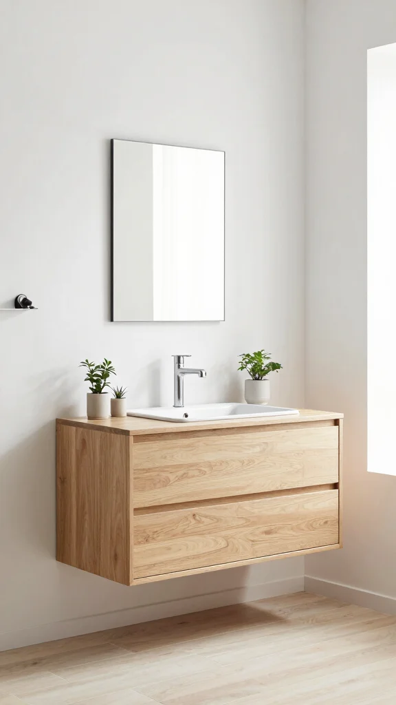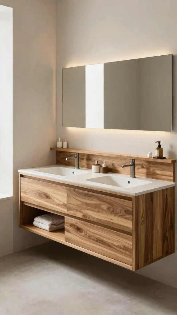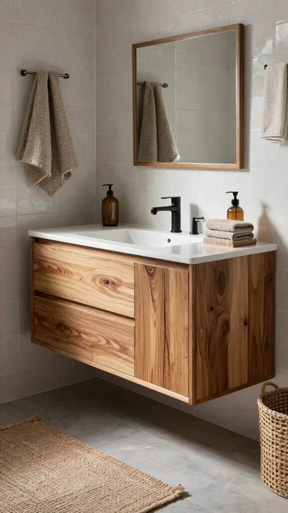 To keep the look tidy, incorporate open shelving or storage baskets that allow the natural wood’s beauty to shine through. Contrasting with darker tiles or walls emphasizes the floating effect, making cleaning easier and the design chic.