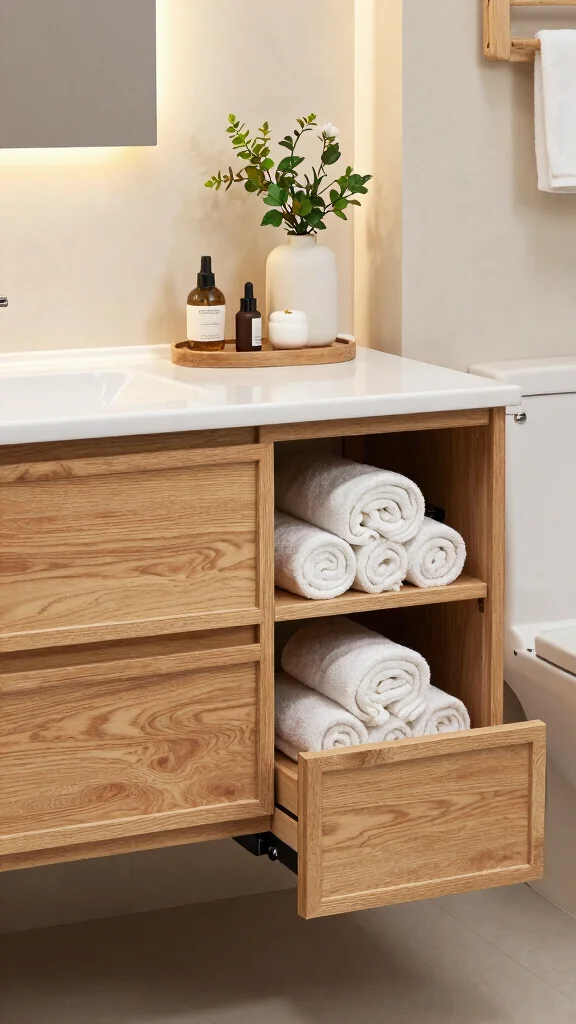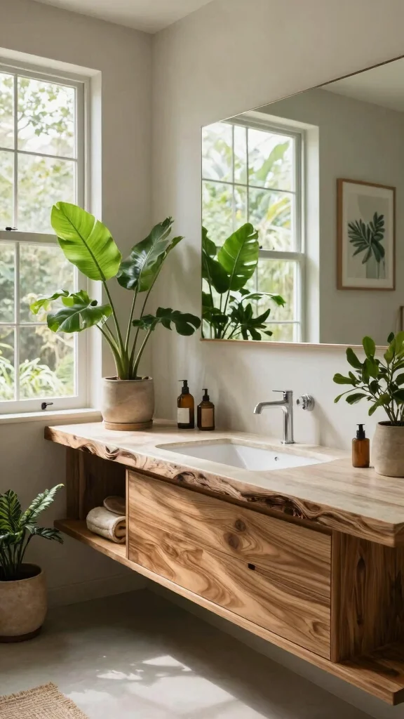 Consider pull-out shelves or baskets for easy access to items, and open shelving allows for decorative displays of rolled towels or curated plants, blending aesthetics with utility. Utilizing natural wood for cabinetry contributes to that warm organic look, enriching your bathroom’s atmosphere.