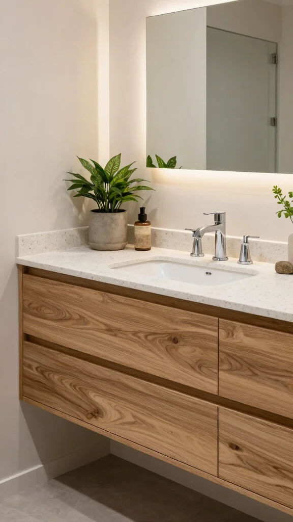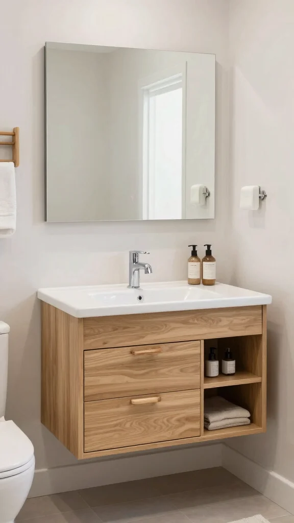 A floating wood vanity introduces a modern twist while maintaining an organic look, adding visual space and making a small bathroom feel larger. By mounting your vanity on the wall, you create an illusion of depth, especially when paired with open space underneath. Consider lighter woods like birch or maple for a fresh aesthetic, and enhance the design with LED lighting underneath for a soft glow.