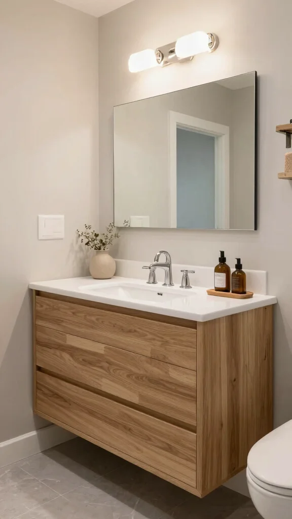 Choosing lighter wood tones helps create an airy feel, making your bathroom appear more spacious. Pair this with sleek fixtures and minimalist decor to maintain a clean and modern look. Adding mirrors can create the illusion of depth and enhance natural light, further expanding the space.
