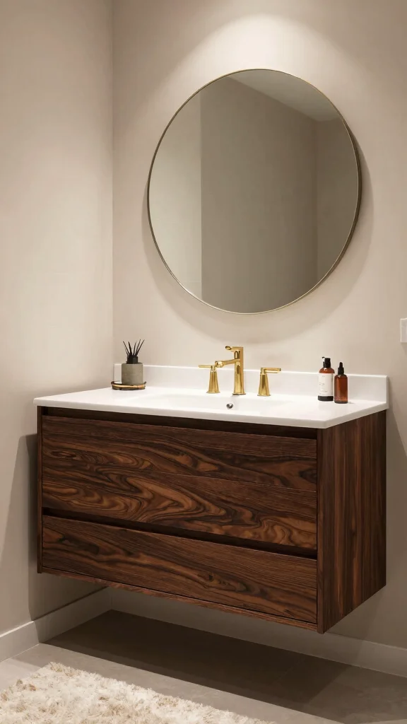 If you want to make a bold statement, a dark wood bathroom vanity conveys elegance and sophistication. Rich tones like walnut or mahogany create a stunning focal point, beautifully contrasting with lighter elements such as white countertops and soft-colored walls. Integrating gold or brass fixtures adds a touch of luxury, enhancing the overall design with warmth and richness.