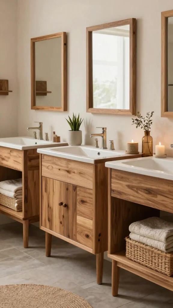 Create a refined look by pairing a natural wood bathroom vanity with sustainable details. Use water-saving fixtures, energy-efficient lighting, and a floating or freestanding design that echoes luxury. Choose a durable, low-VOC finish in a soft sheen to highlight grain without glare. Add eco-friendly bathroom ideas like reclaimed wood accents, natural stone or porcelain countertops, and organic textiles. For warm color palettes, layer creams, taupes, and amber tones against the wood. Accessorize with quality hardware in warm metallics (brushed brass or antique bronze) to elevate the look without sacrificing sustainability.
