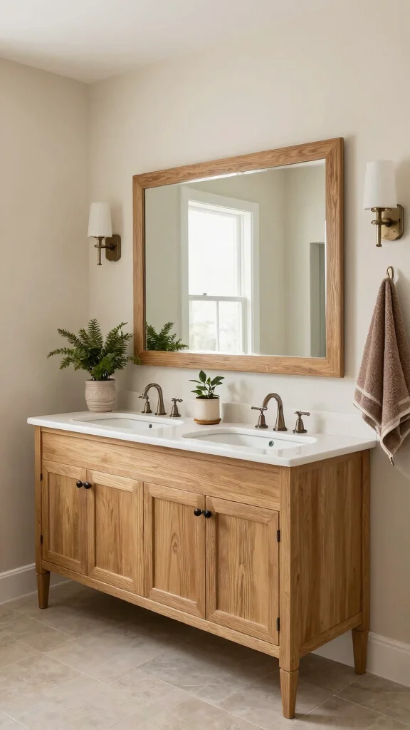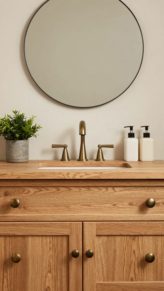 Choose an oak vanity with a visible grain and a protective natural wood finishes look, paired with a stone or quartz countertop for durability in a bathroom design. Add a framed mirror, wooden open shelves, and soft, earthy accessories to emphasize rustic decor.