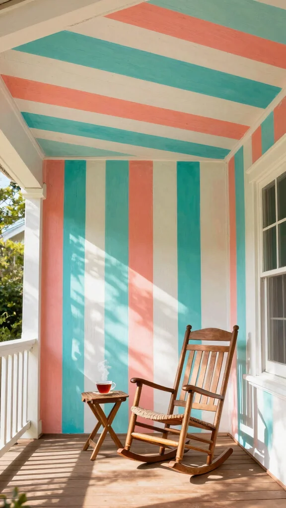 We turned a plain porch ceiling into a focal point with bold stripes and painter’s tape—cheap, doable, and totally worth it. Proof that porch ceiling ideas cheap can transform outdoor living without breaking the bank.