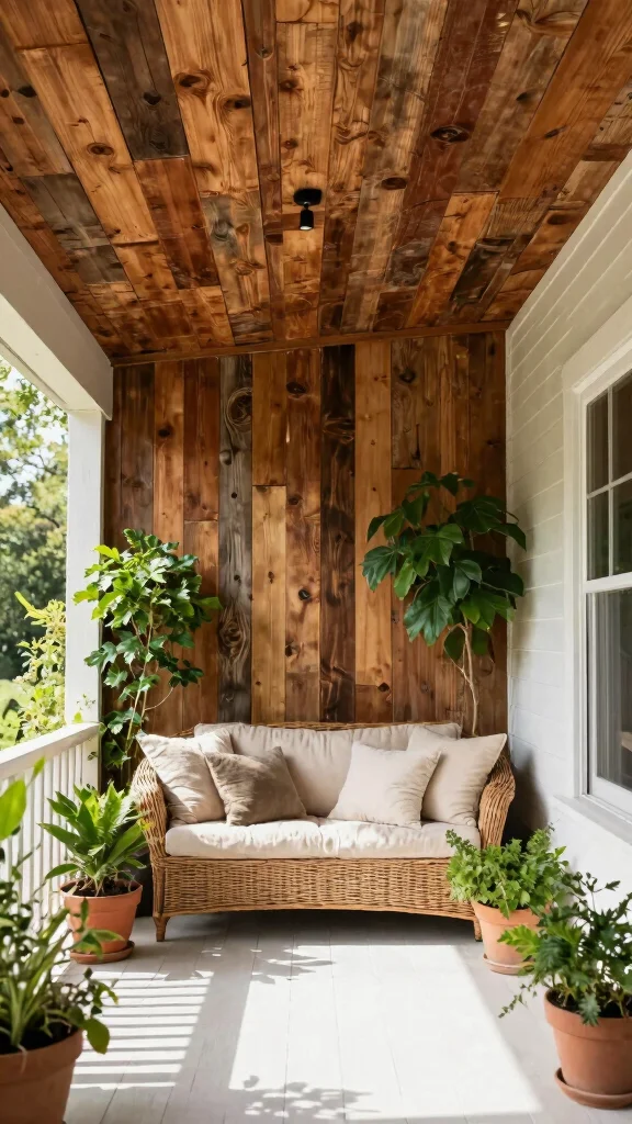 For a warm, farmhouse-inspired look, consider using reclaimed wood planks on your porch ceiling. This sustainable choice not only adds character but also embraces environmental consciousness. The rich texture of the wood can transform a plain ceiling into a stunning focal point filled with charm.