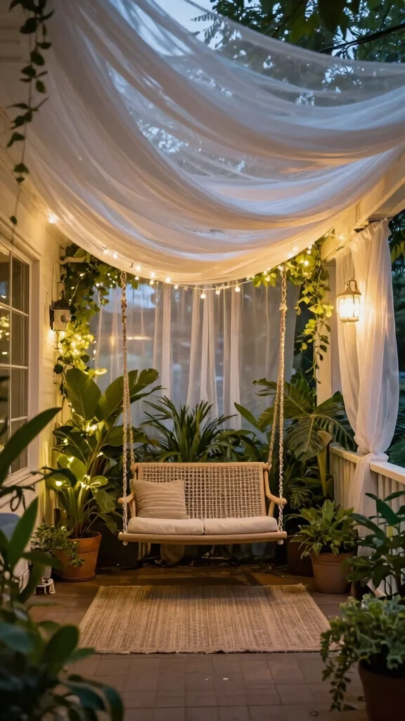 This simple upgrade will enhance your porch’s ambiance significantly. The interplay of fabric and light creates a tranquil retreat, inviting you to relax and unwind.