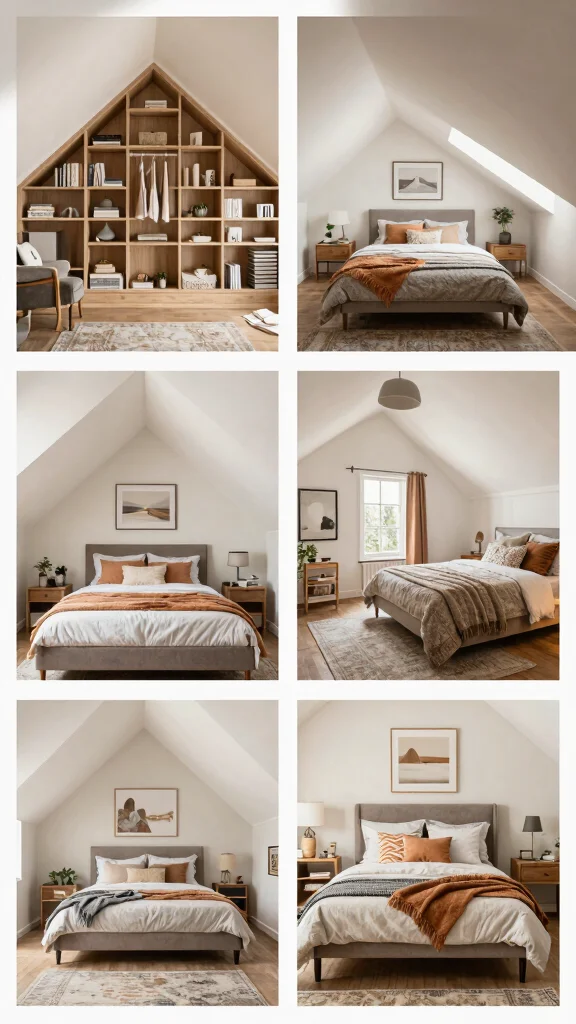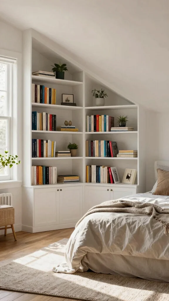 Custom shelving is a brilliant way to embrace the unique angles of a slanted ceiling. This design choice not only utilizes every inch of space effectively but also introduces a distinct architectural feature to your bedroom. For instance, built-in shelves that follow the slope can beautifully display books or cherished decor, adding both function and style to your space.