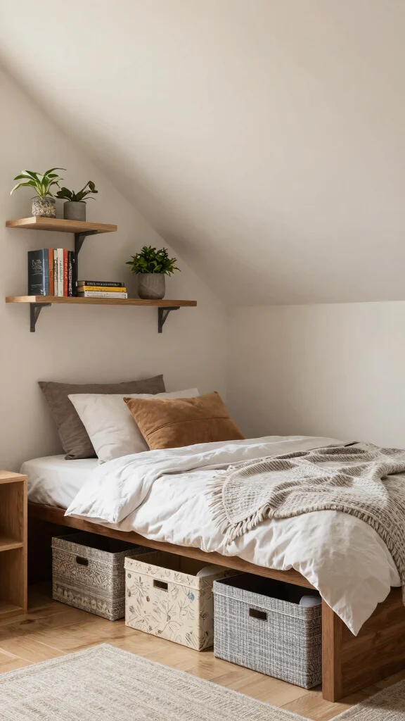 To maximize a small space with slanted ceilings, start with smart storage under the slope, a low-profile bed, and wall-mounted shelves to keep floors clear.