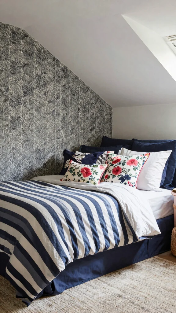 Use a mix of patterns for textiles, such as striped bedding paired with floral pillows, ensuring they complement each other. Consider patterned wallpaper on one wall or the ceiling to add visual interest without overwhelming the room.
