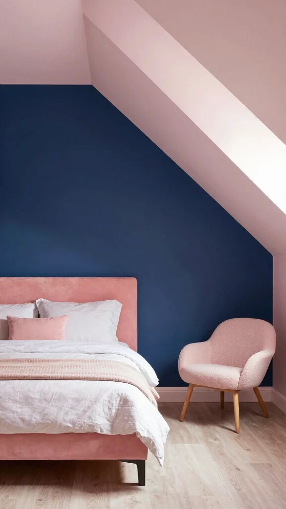 Color-blocking is a trendy method to introduce visual interest in your bedroom. By defining distinct areas with contrasting colors, you establish a sense of separation in a room featuring a slanted ceiling.