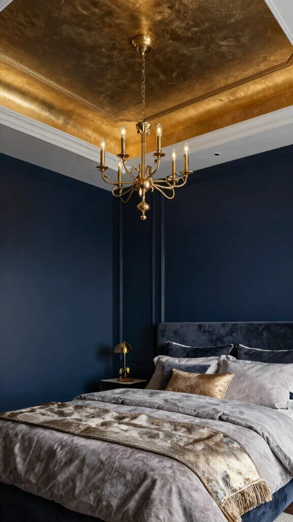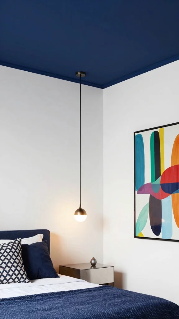 Did you know bold contrasts can visually lift a bedroom by up to 10-15%? For tray ceiling ideas bedroom, a navy ceiling against white walls draws the eye upward—pair with pendant lighting for drama and a taller feel.