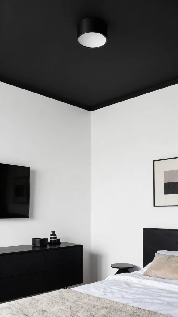 For a chic urban feel, consider a black and white tray ceiling design. A stark black tray contrasting with white walls creates a bold yet minimalist look that exudes sophistication. This style pairs well with modern decor, adding a sleek and streamlined aesthetic to your bedroom.