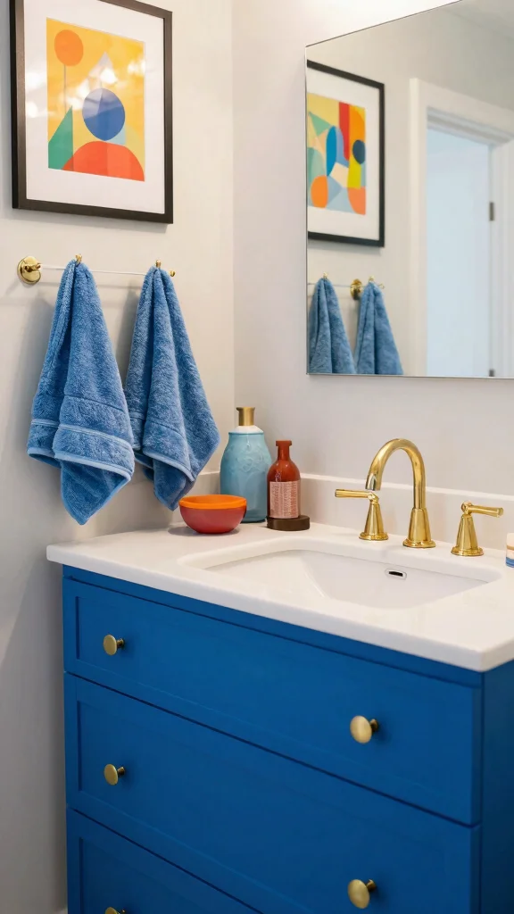 Use a light color palette and reflective surfaces to keep the room feeling airy, and integrate a vessel sink or under-sink organizers to keep essentials neatly tucked away while you showcase stylish accessories.