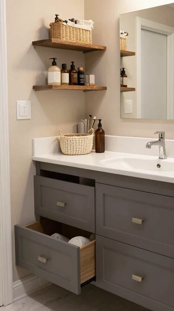 Think vertically and modular. Use tall slim cabinets above the sink, a mirrored medicine cabinet, and pull out organizers inside drawers. Add door mounted organizers on the vanity doors and utilize the space beneath the sink with adjustable shelves or pull out baskets for functional storage solutions. Choose a vanity with interior dividers and consider glass or open shelving to maintain a sense of airiness while keeping bathroom organization at the forefront.