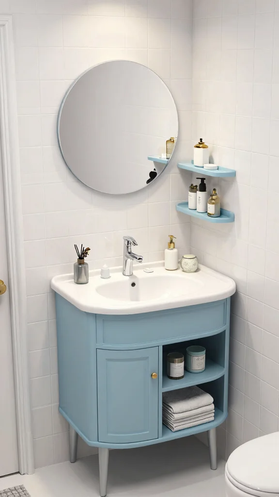 For a functional setup, choose a corner vanity that offers rounded edges to enhance the sense of space. Light-colored finishes can help brighten up your bathroom, making it feel larger and more inviting.