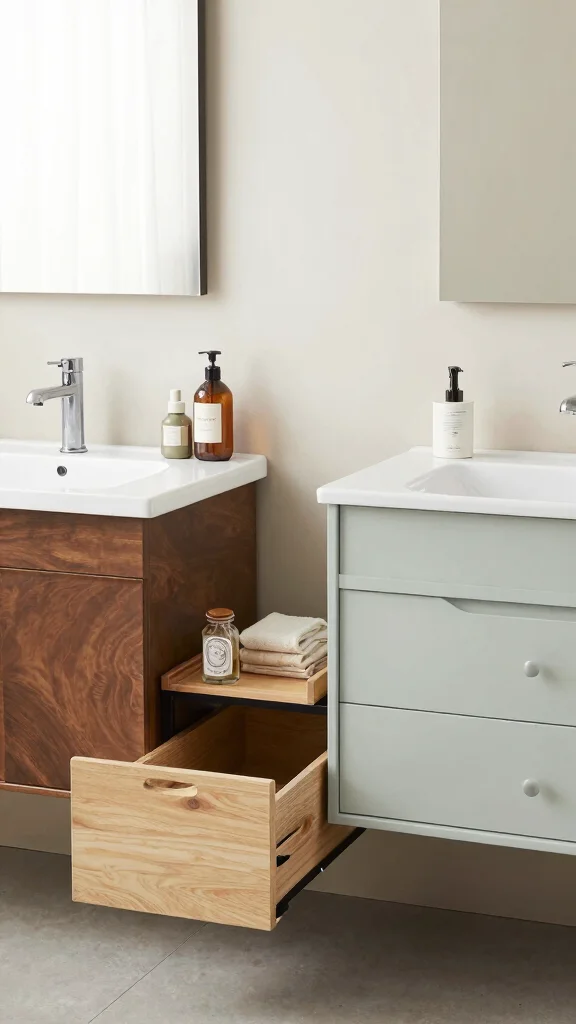 Sleek minimalist vanities are perfect for those who appreciate simplicity and modern design in their bathrooms. These units focus on clean lines and neutral colors, creating a calming atmosphere that enhances organization. Imagine a chic white vanity with integrated storage, keeping your essentials neatly tucked away while adding a sophisticated touch.