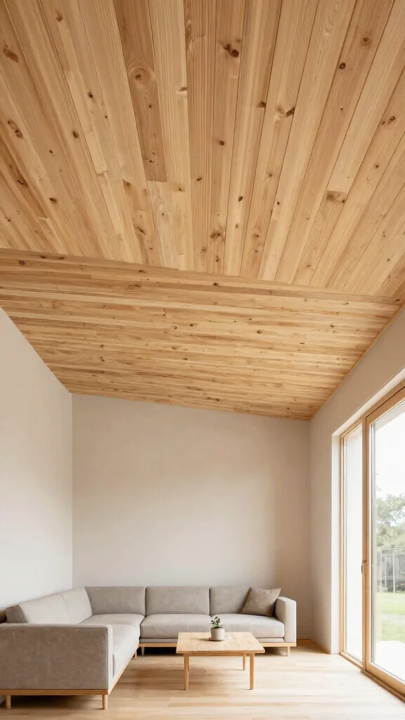 For a clean and stylish look, consider using narrow natural wood strips for your ceiling. This minimalist design allows the wood’s beauty to shine without overwhelming the space. Natural wood strips can create a sleek appearance while retaining rustic charm. Whether you select a uniform color or different woods, this design is both visually appealing and versatile.